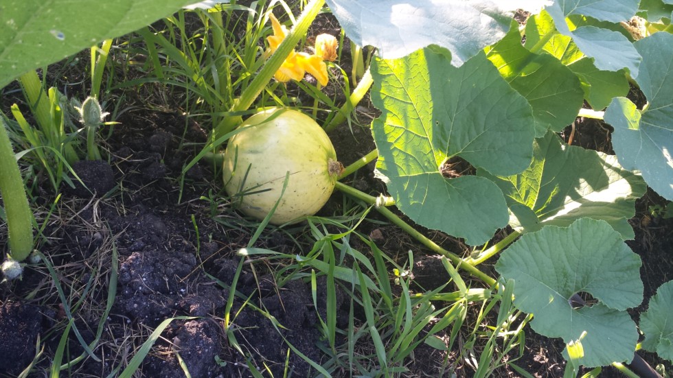 7 Dap looks like its adding pumpkin is turning from green to yellow it seems i believe this is a gigantic ghost pumpkin variety or a gigantic lumina set another one on the same plant about 2 feet further down the main vine thats in a better spot i feel like will have to make a decision in a week or 2