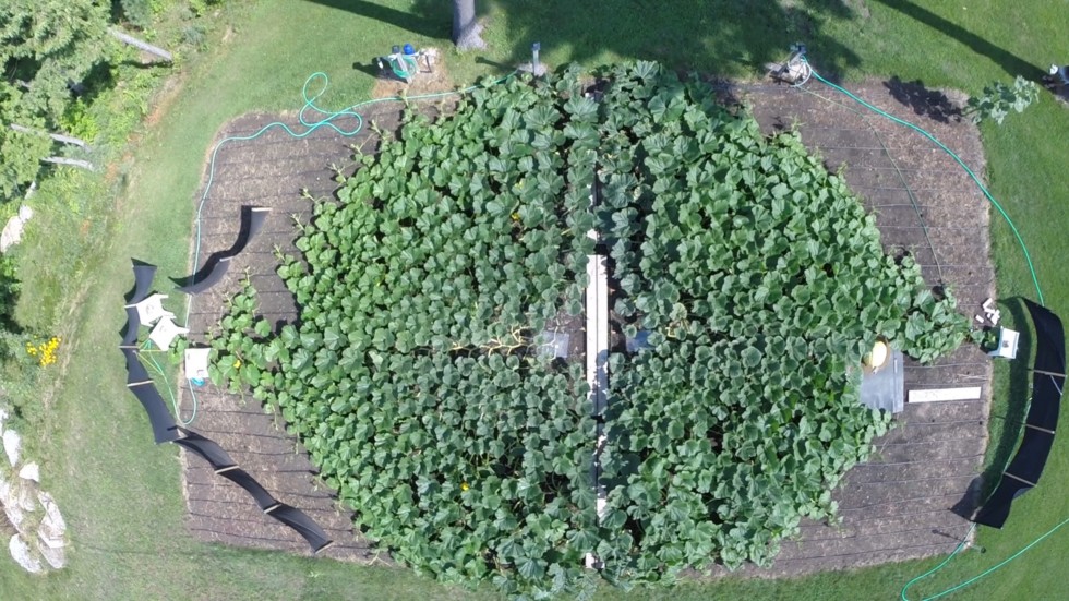 I mixed up the plants on the first overhead picture. It's actually the 1725 Harp on the left side. You can see where I cut off a small fruit that aborted, I'll grow vines into that area. I have a three day old Harp under the first patio table...hoping it takes in the heat we've had.