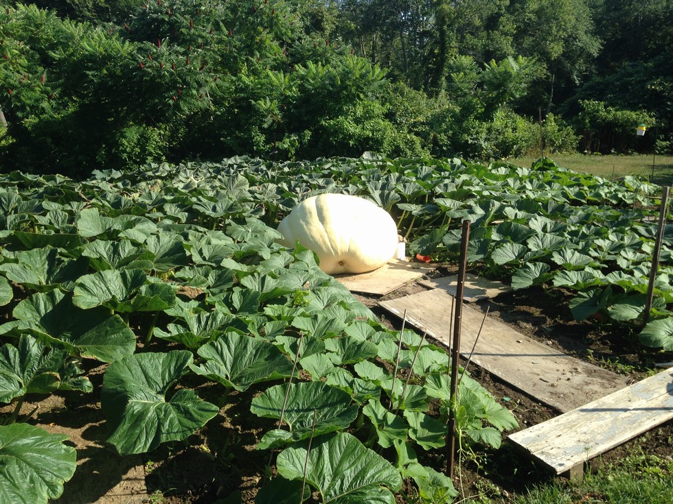 The 1998 Jutras pumpkin. Pollinated on June 23, and is thirteen feet up the main. This plant has about 900 sf of growing area. Just a few small vines left to terminate