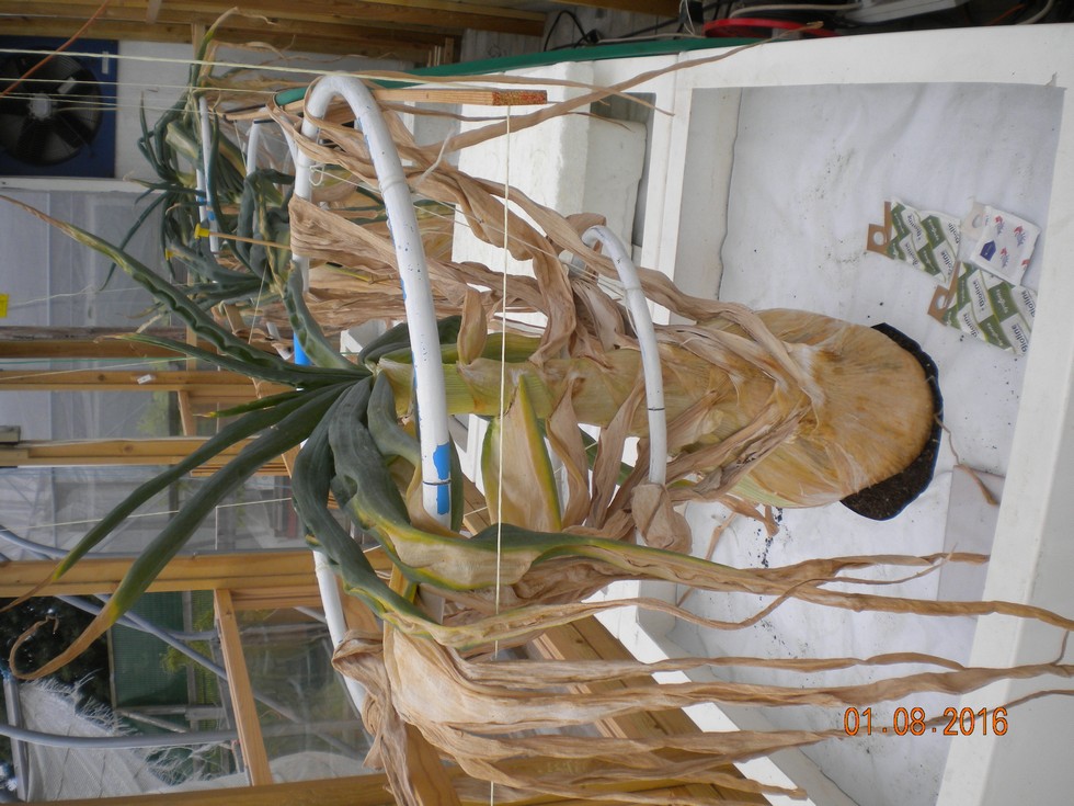 New frame Onion has suffered during the 10 days of 30c + temp's no new measurable growth this last week, 23.5 inches high x 28.0 circ. 13 leaves. do not think they will need any more water.