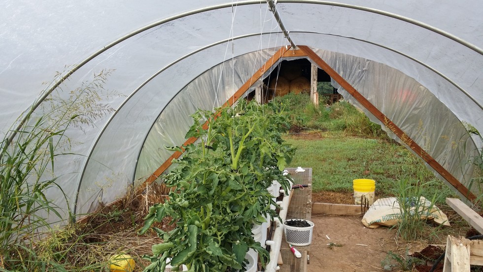 I really like having the tomato plants elevated. I've tied a guide string to the top of the greenhouse for training purposes. Gravity carries the excess fertilizer back to the storage bin for recycling. No pit to dig to hold the bin.