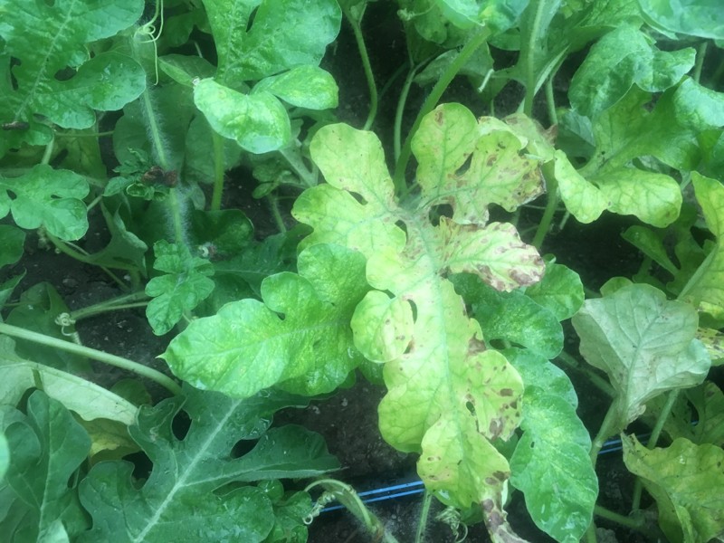This apparent fungus (based on online research) has been spreading rapidly on all four of my melon plants. The evening light doesn't do justice to the yellow appearance seen in person. Just hit it with some Eagle 20. Seven days ago, there was no sign of this, as all plants were Green Machines.