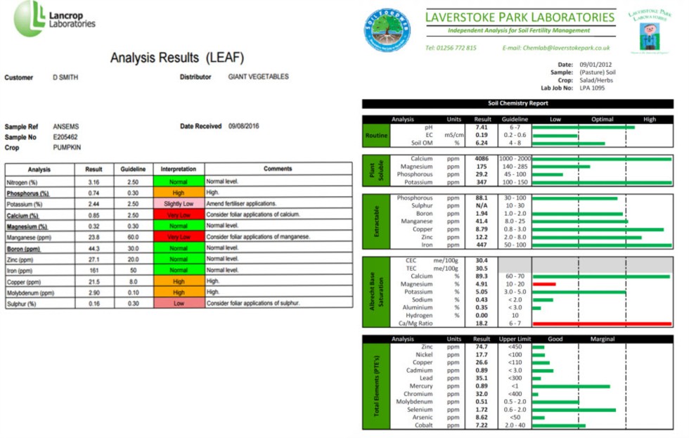 Now, this is a little OTT for my rather modest Giant Pumpkin ambitions... But I had a tissue test for the big (and better pumpkin) to give me an idea what's going on generally behind the scenes to help focus in future years. An old soil test for the larger site attached too - it's had a lot (!) of cow manure added which will start to pull down pH - but nothing else. Tissue test of "very low calcium" blows my mind. There's 4000 ppm in the soil! Not making it from A to B, although I'm not sure why. Sulphur / Manganese look easy - but boy, I'm trying to get my head around the calcium thing. Is adding plant soluble calcium to a soil which already has calcium (potentially insoluble?) a good idea? Is it there, but other factors (watering, high ph affecting Boron, K competes with Ca) affecting uptake? I also know that calcium doesn't move well. Getting some good input on the Giant Vegetable Facebook group; IanP suggested looking at Boron levels to help Ca flow + lab suggesting direct application to fruit as foliar application unlikely to help increase calcium in pumpkin. If anyone one else has input - please share! Love to understand what's going on.
