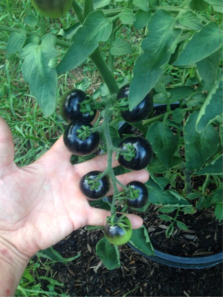Dark cluster variety in this pot, big beefy stalks off of a rather skinny potato stem.