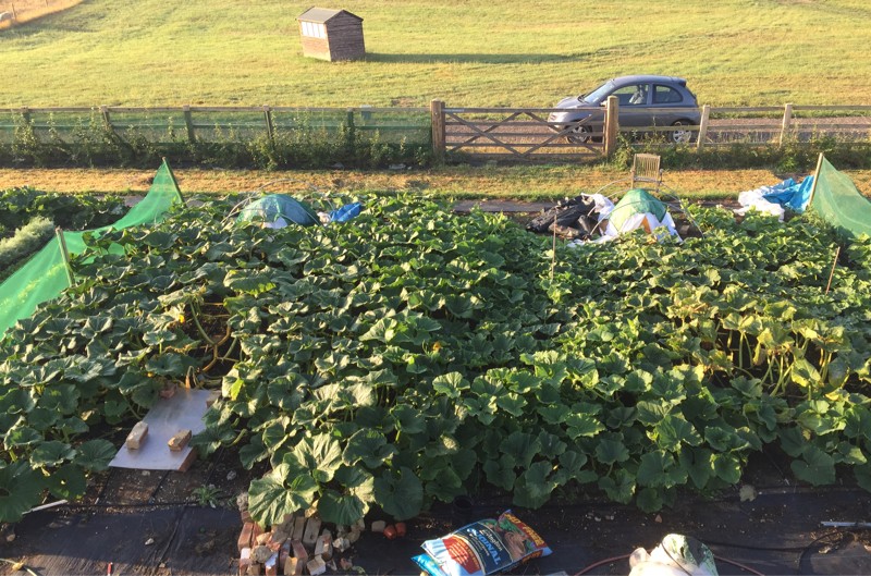 Patching looking full; a lot of unburied vines in there tho...(shh - time is not my friend). Plants healthy, but a few more powdery mildew spots appearing. More foliar SB applied & worst leaves removed.