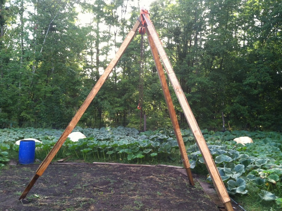 This is our lifting tripod. 16 foot 4X4's reinforced with plywood. It's heavy to set up, but once it's up, we leave it up for the season and it can easily be "walked" from one pumpkin to the next. It's nice to be able to load pumpkins by yourself if necessary.