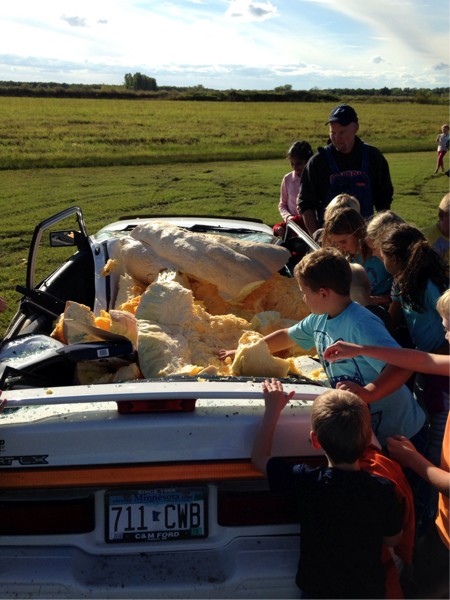 This is what the pumpkin looks like after we dropped if from a crane 80 feet up onto a Ford Escort! The car didn't fare to well! We raised $475 for the local Literacy Council which buys books for kids each month. It was a dollar per ticket for a chance to pull the rope to release to pumpkin.