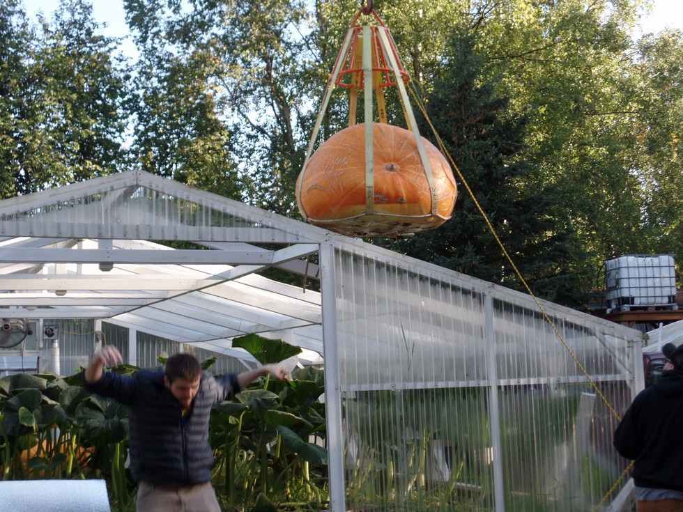 1st pumpkin off the 1317 , coming up and out lifting crew taking over ...new IBC water tank on 10 ft platform in background