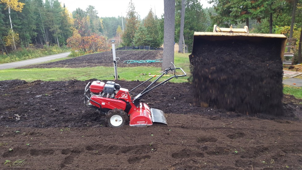 I got last falls composted leaves and coffee mixture spread over the two plots and tilled in during today's nice warm, but wet weather. More worms this year than ever.
