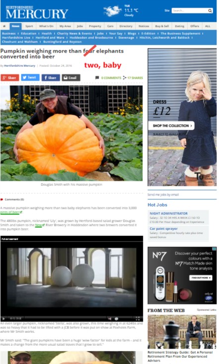 One of my giant pumpkins is now officially a pumpkin beer & 3,000 pints - headline seems to have added a few baby elephants to the weight and lost the all important qualifier 'baby' - but "hey ho! Opening paragraph is right at least
