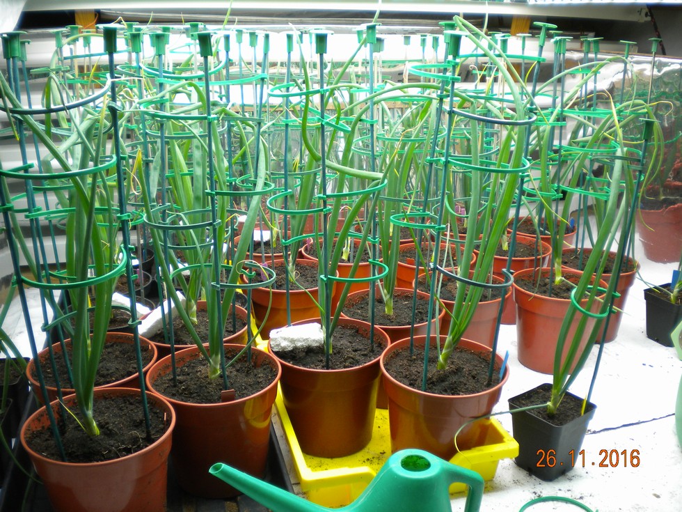 Early Onions out of 24hrs after 5weeks, now on 9hrs but still in growth cabinet. Potted most on into 9" from 4" as pots were full of root. 6 leaves on best.