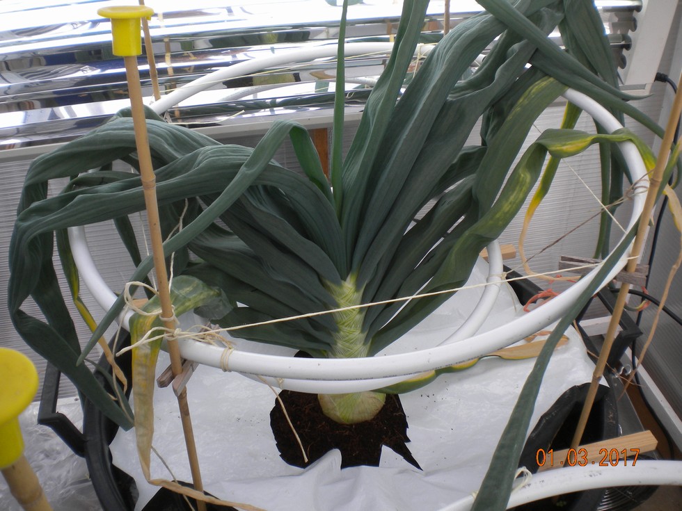 Onion planted at Christmas in my greenhouse is looking stronger now, this one is growing in Canna Coir compost but it suffered from tipping early on, have been watering more with a weaker feed.