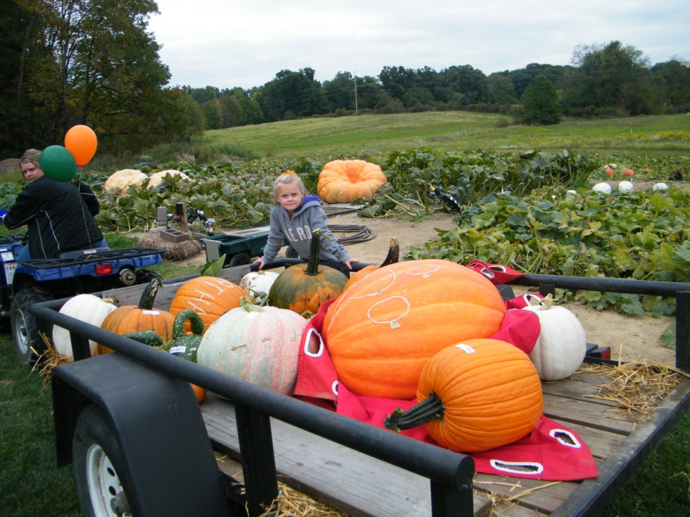 Hannah and Heather bringing a load of pumpkins out of the patch.