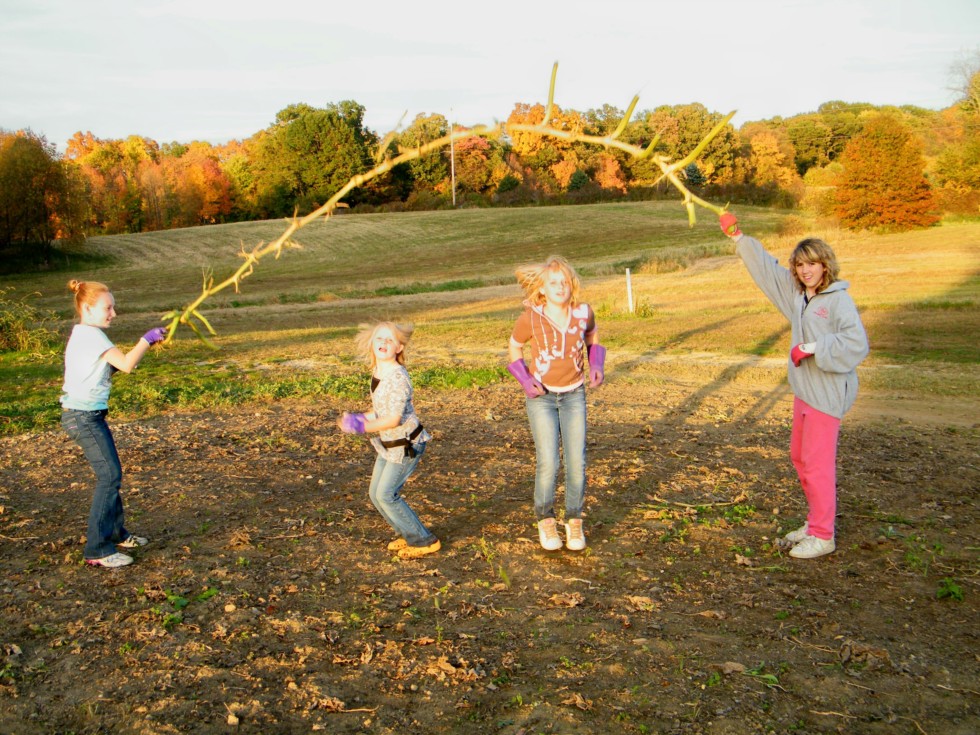 One fall, the girls helped me strip the patch. I turned around and saw them jump roping with a pumpkin vine!