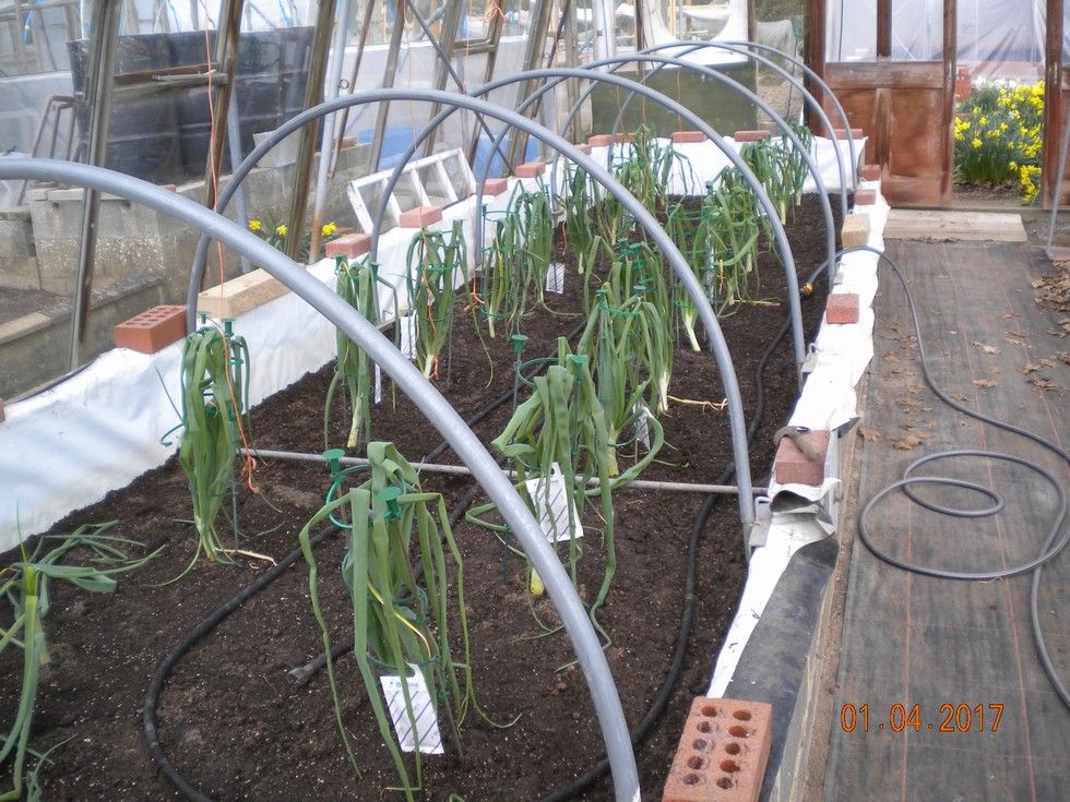 Planted out my Exhibition Onions into an old raised bed in the large greenhouse yesterday. Will cover over with fleece if cold nights forecast. Still have to fix leaf support rails.