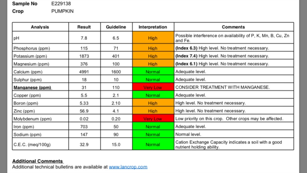 Had my soil test results back too. Three slight shocks, but everything else as expected: pH has shot up since last year. Not sure why or whether to do anything about it. Molybdenum low but doesn't seem to be a major concern. Manganese is the real unexpected one. Not sure what to do about it, thinking of treating with manganese sulphate in my dosatron. Any thoughts/experience from fellow growers on this?