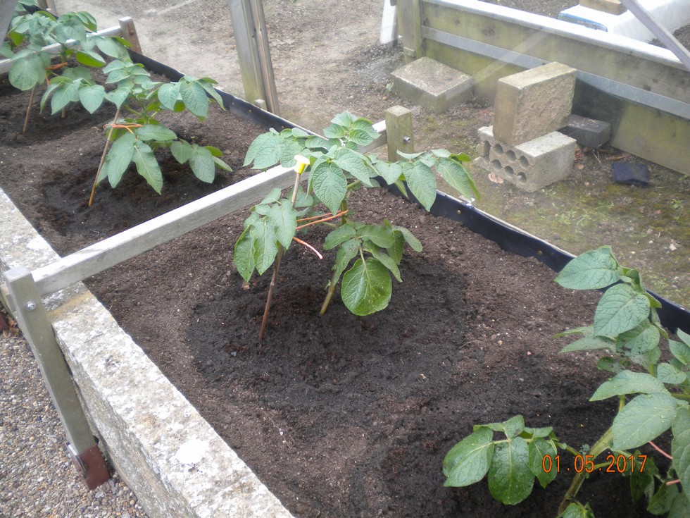 Planted out the first Potatoes into my front frame from 9inch pots. Tried to thin out the tiny new tubers first.