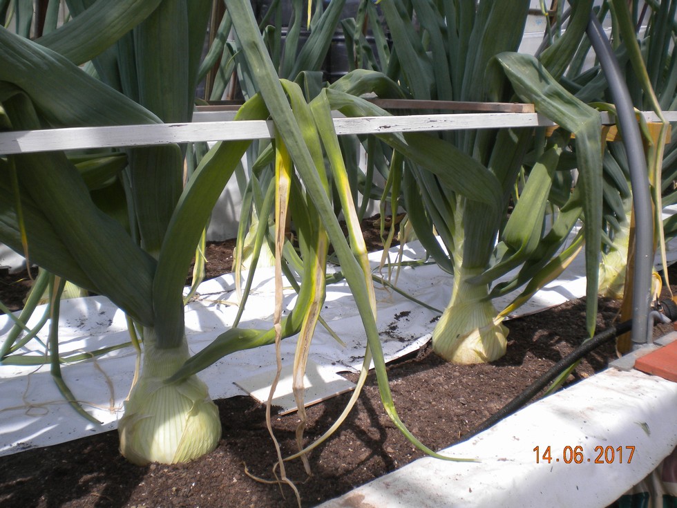 Exhibition Onions are mainly being grown in an old raised bed and are looking flat at present, good size but not happy with the shape.