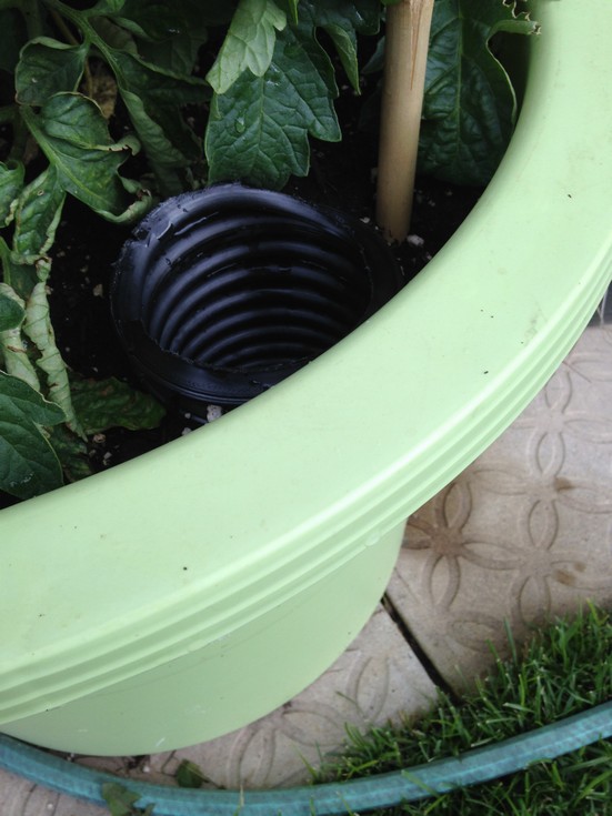 LanTerra Update, Ketchup Journal > So one of the things I always worry about is adequate moisture levels...One of the 25 gallon pots has a sealed bottom, the plan is to allow for an in pot auto watering system for its soil. The bottom has been filled with 3" perforated drainage pipe and covered with two layers of window screen. Another 3" inch pipe is placed vertical and runs up to extend beyond the soil surface and acts as a filling pipe. The filling pipe also acts as an air pot would as it too is perforated. Two drainage holes are drilled in the pot at a level just above the top of the tubing....This allows for 3" of standing water to wick up moisture into the soil...Re filling occurs every few days as this increases the watering intervals greatly and ensures consistent moisture levels of the soil.....Flushing will have to be done weekly to control disease issues...See You Tube > self water pots.