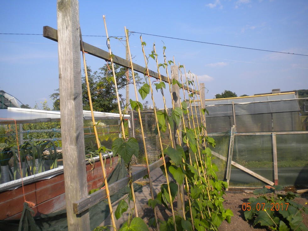 First runner beans have reached tops of canes and are being stopped. Look far healthier than last year at this time.