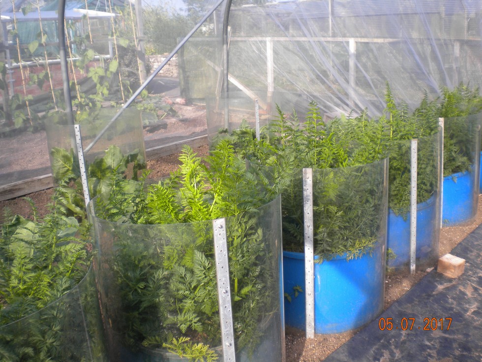 Heavy Carrots emerging from tops of their protective clear barrels, free of pests/diseases so far.