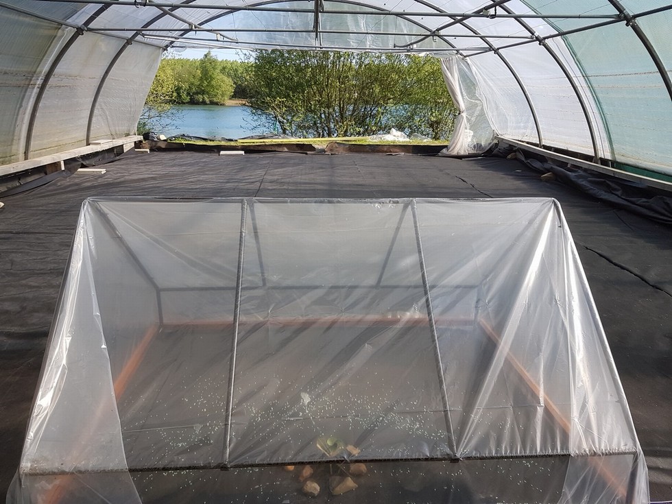 I covered the soil with a breathable and permeable black weed barrier and transplanted my only pumpkin plant of the season. 2230.5 Wallace is now sitting in his new home and watching the lake ;-)