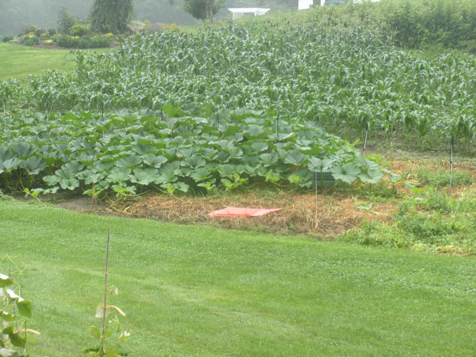 1929.5 Barlow, on the right growing over the pea straw mulch. On the left it is the 1795 McCracken. Growing over traditionally tilled soil. Sweet corn in the background. Mostly supersweets.