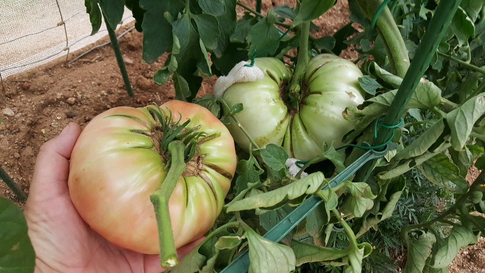 Picked today. Out of 4 plants this one was the runt. Double on right is on the most aggressive plant couple more days. Both these tomatoes are from first tier blooms. One foot off the ground.