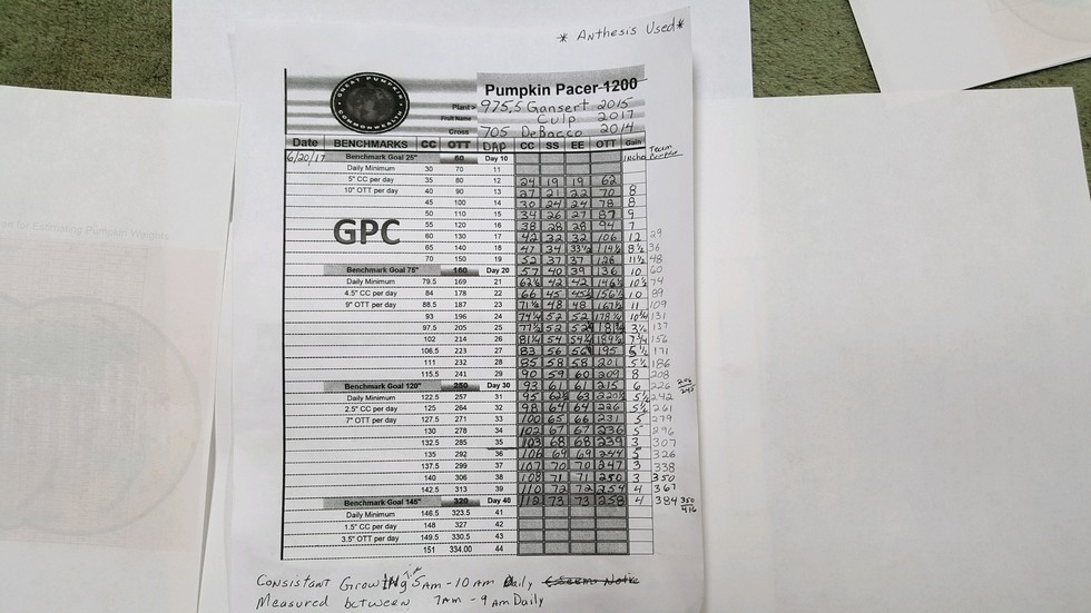 I have measured daily for my records. I'm trying to make reasonable records for future use. I have a lot to improve. It is my understanding if I used and mixed the Anthesis correctly that this next week I should start to see the results. I plan to forward all info to Matt at the end of my season. The plant growth stalled when the pumpkin set for awhile and has started to vine again. This plant is currently 600 square feet. I did not use cables or a hoop house for plant. I may try to go earlier next year for bigger plant before pollination.