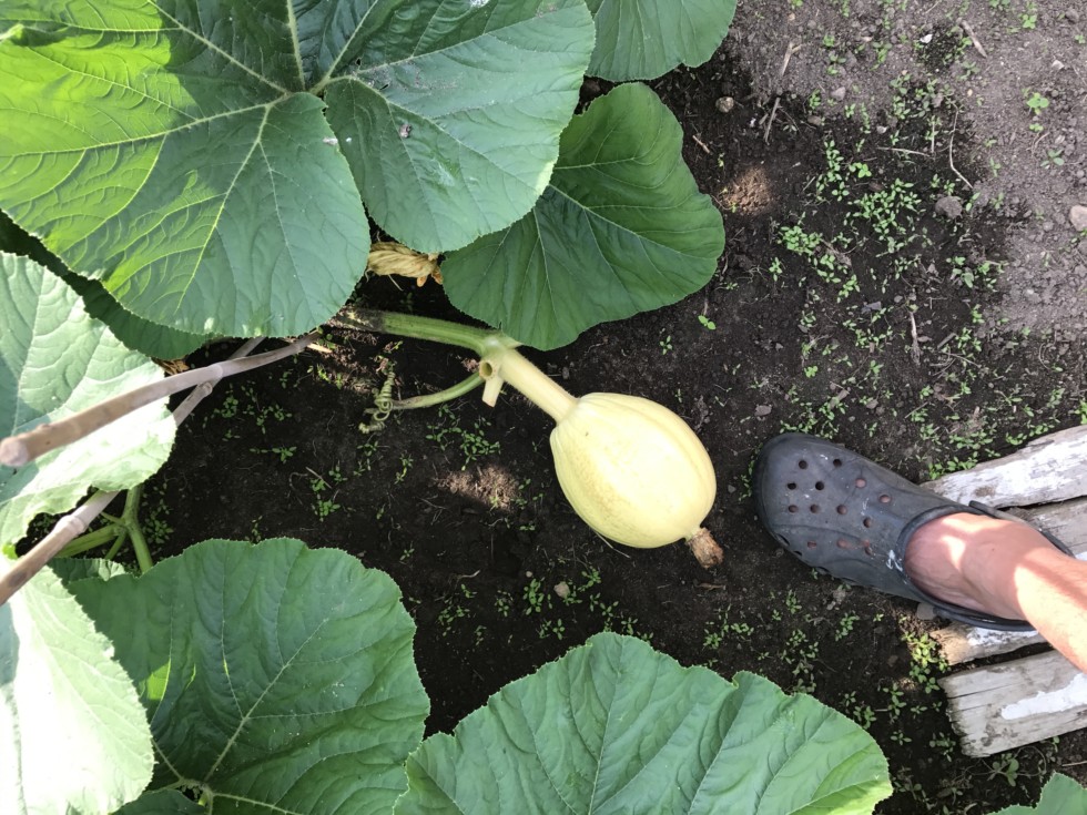 Pumpkin on the 1961 Sperry. This is a three lobed flower pollinated with the 2307 Wallace on July 8. It is at about 15 feet out on the main. The main was terminated at the pumpkin, something not ordinarily done in my patch.