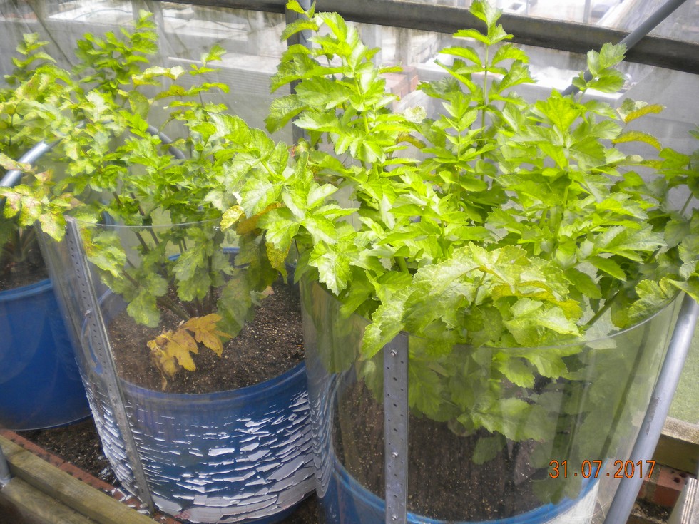 Heavy Parsnips in the netted tunnel have weak pale foliage, not looking to good for large roots under the surface.