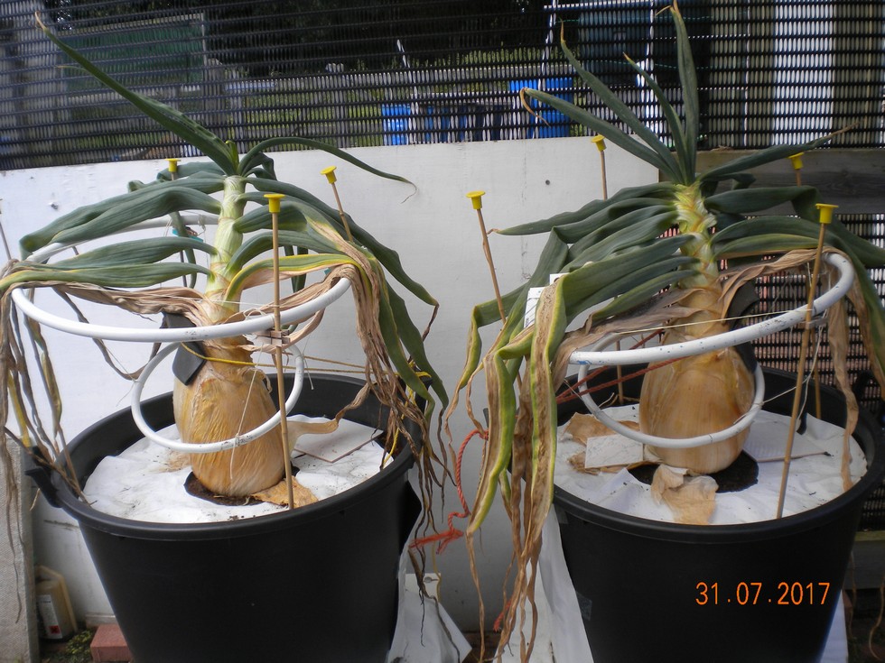 The two giant Onions in moveable pots have made little growth through July, the left one is in Canna Coco, the other in Soil based John Inness. Have not benefited from being able to bring them outside during hot days.