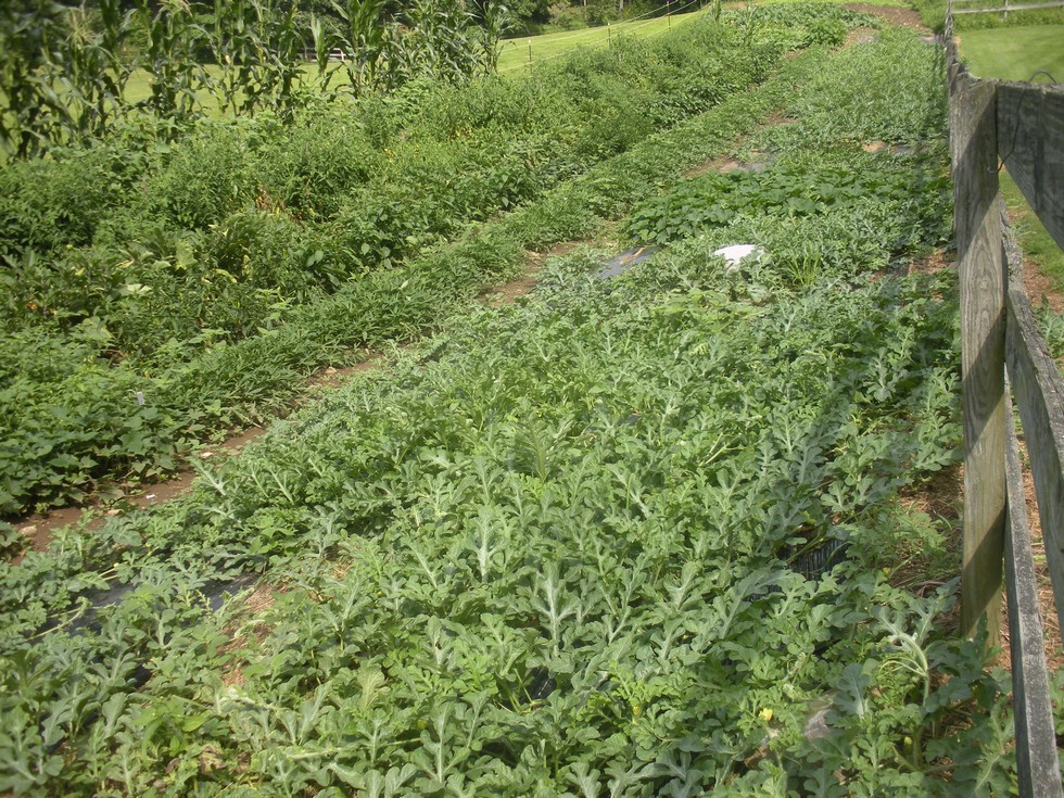 A long row of melons. It is nice to see such healthy plants. Mostly 'Jubilee' in this row