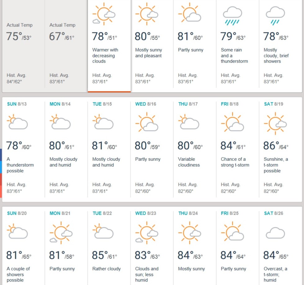 Clouds here and there in the extended forecast, but the temps I like. Low to mid 80's for highs, and low to mid 60's at night. Seems like good growing temps to me. Has to be better than the cold/wet weather we have had for a little bit, or days in the 100's, which we also have been known to have. So, all in all, I'll take it. Not as if complaining about the weather will change it anyway.