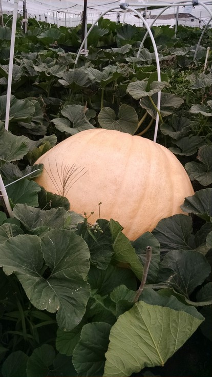 Patton 2157 genetics plant. Crossed with 2106 da beard.300sq ft plant.no burying,no drip tape,two wheel barrels of compost for patch prep-wish I would have given this plant a good spot.Its measuring around 800lbs-it tore its stem half off the vine about two weeks ago ,I had to prop up the main or it would have picked itself.