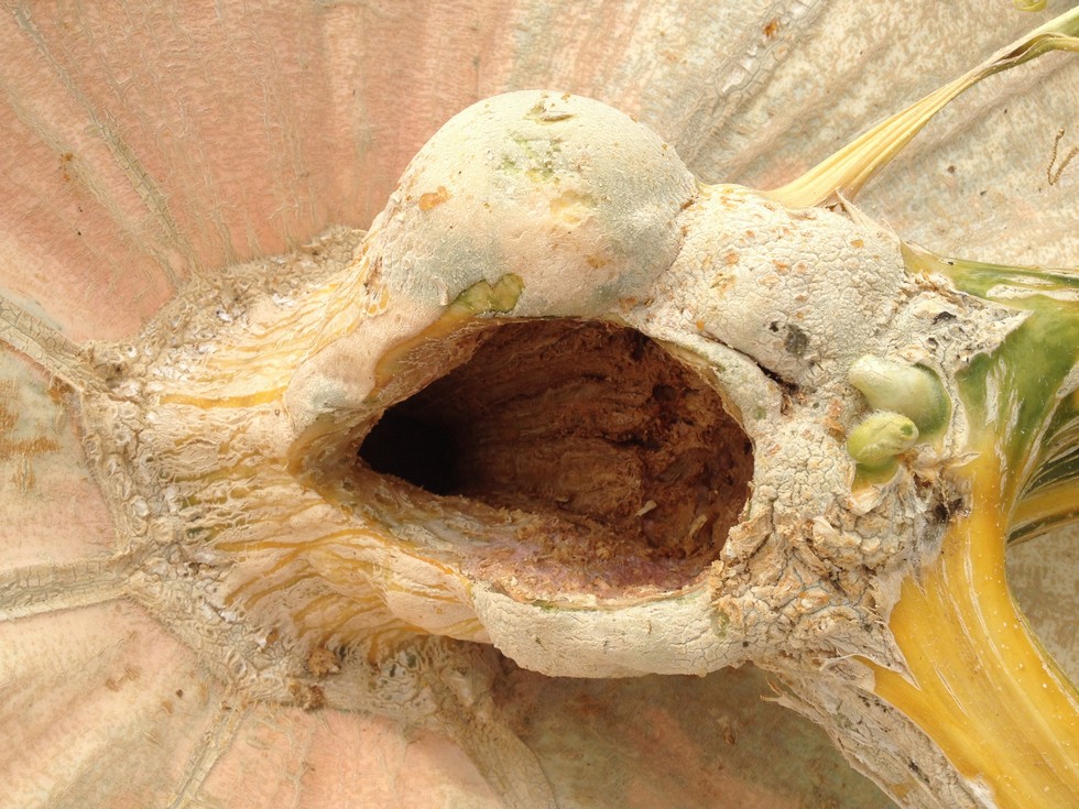 A couple of weeks ago I found a puddle of water around the stem of our biggest 1949 pumpkin. The water must have come in through the vents when raining and not shutting in time. The long and short of it is that yesterday Stuart and I found a tiny soft spot in the stem which grew to a mighty hole. We now have a fan on it and we will see over the next few days if it dries out.