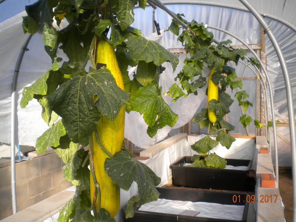 Giant Cucumbers are starting to turn yellow which means that growth will slow, mildew on the leaves is not helping.