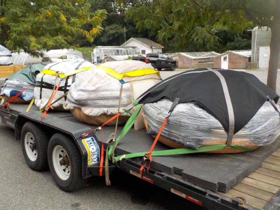 Here is another view so you can see how the whole load works & a better look at the foam this stuff is awesome for transporting. For this load we do not use pallets just cover the floor of the trailer with the foam rubber it makes it easier to pack & we have pallets waiting for us when we arrive (we get the OK to do this before we leave). At all of the weigh-offs we attend the pumpkins are on a pallet so we don't hold up the unload crews all we have to do is undo our ratchet straps & pull the tarps or squares off.
