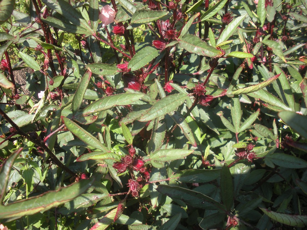 This is a Roselle plant. I did not know if this would grow in the North or not. Apparently it does. I would say that if you can grow Okra, you can grow Roslle. (aka Sorrel or Jamaica) The latin is Hibiscus sabdariffa. A friend in Oklahoma had sent seeds and it did very well. You can make a tea or juice from the Calyces that surround the seed pod. The juice is a bright red color and looks and tastes a little like cranberry juice or maybe pomegranate juice. You have to add sugar though if you want it to be sweet.