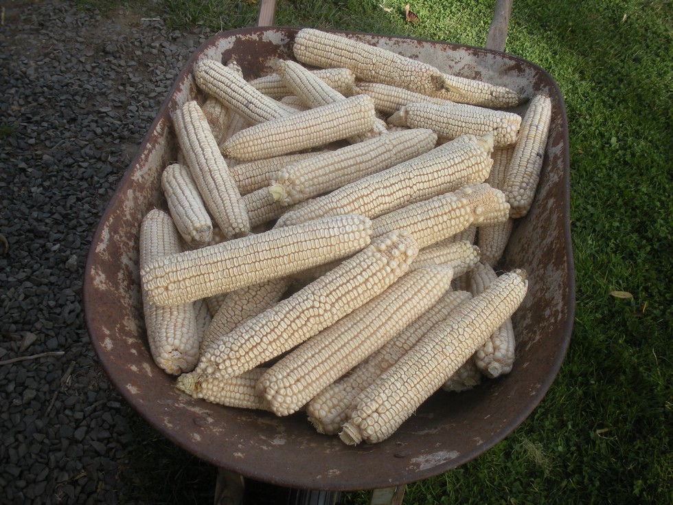 A wheelbarrow full of the 'Boone's County White'. Such a high yielder of grain, and it grows on 12-15' stalks. It has been my dream to see a field of this planted somewhere. People would marvel at it. They would probably speculate that it was GMO or something. Ignorance abounds!