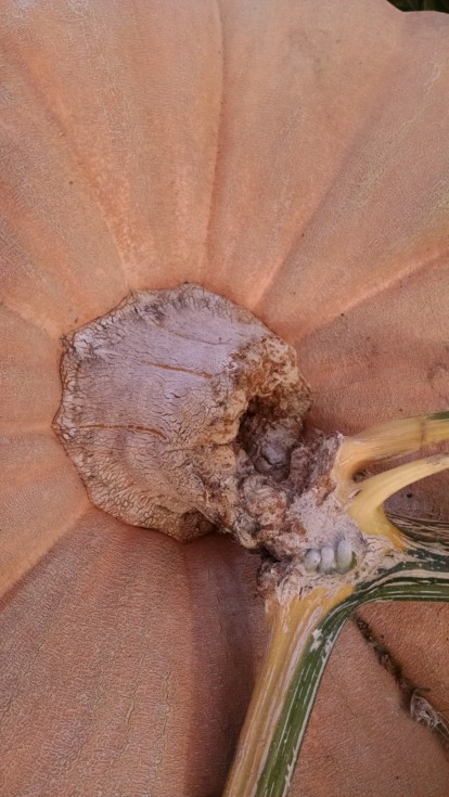 Close up of where patton fruit tore 70% of stem connection before I relieved stem stress. The fruit put on another 400 pounds after the tear and grew symmetrically-"very interesting"