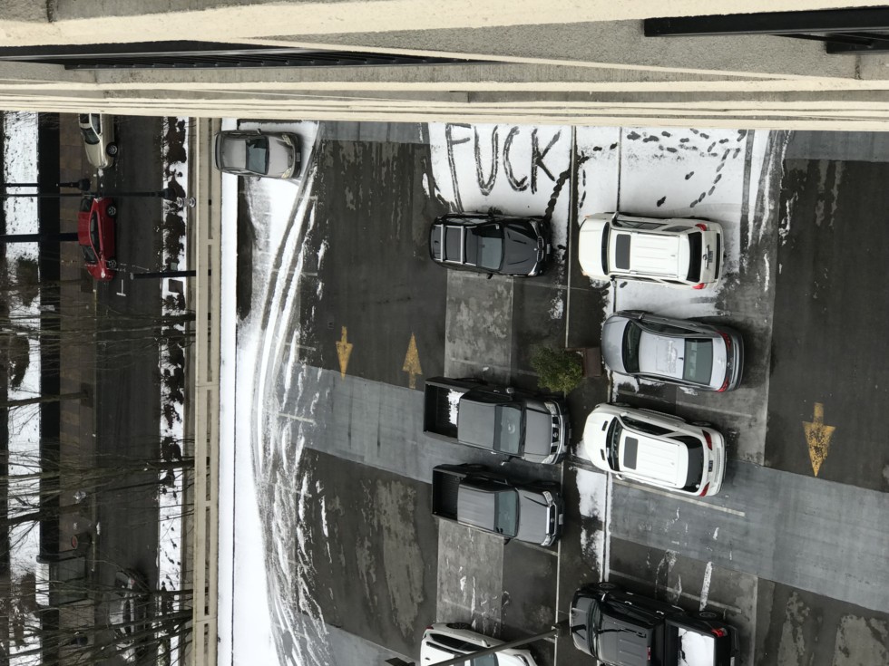Zoom in this was on top of parking structure... ice skating girls must have done it or eddy and mark