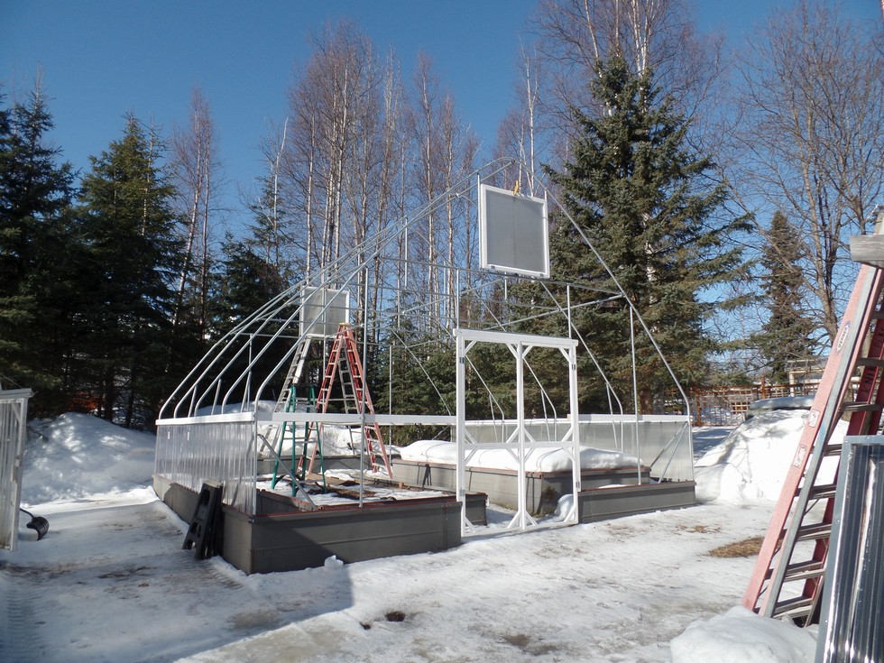 another look at the new gh ,it got a little out of hand as the crazy thing is almost 18 ft at the peek and 16 ft step ladders are a pain to move around ..lol..I just got my greenhouse poly off the barge from Tacoma today, so I'm hoping to be all closed in by the weeks end..