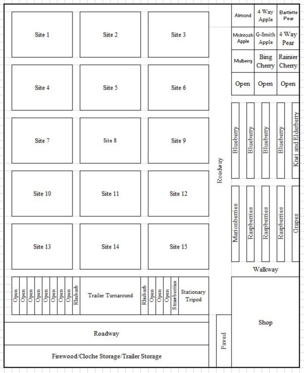 I noticed yesterday I mentioned sites #1 and #3 but didn't mention what that means exactly. I always think it is good to go into a season with a plan and a set of goals. It may be to grow 50 pounds of blueberries, not let one weed grow in the strawberries, or grow a 2000 pound pumpkin. Whatever it may be, draw things out, write them down, it helps. This is an overview of what our garden looks like. For reference, each of the 15 pumpkin sites is 1200 square feet at 30 feet x 40 feet. As this spring progresses I will reference this as we add veggies to the 'open' spaces and set what sites the giants are going in.