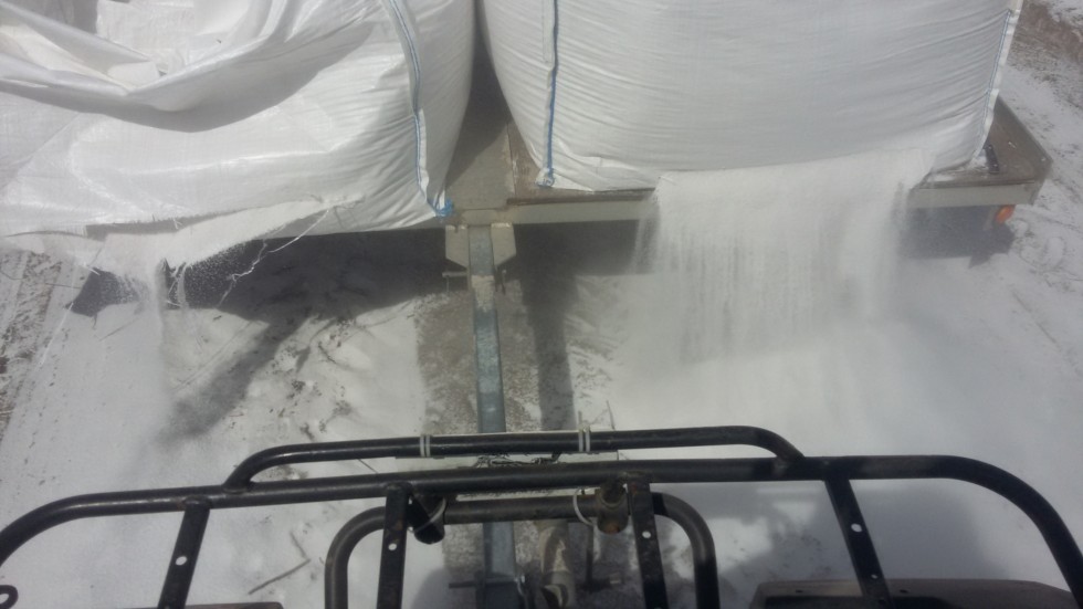 My new spreader, left bags on my snowmobile trailer and cut holes in bags and pulled it around with my 4 wheeler