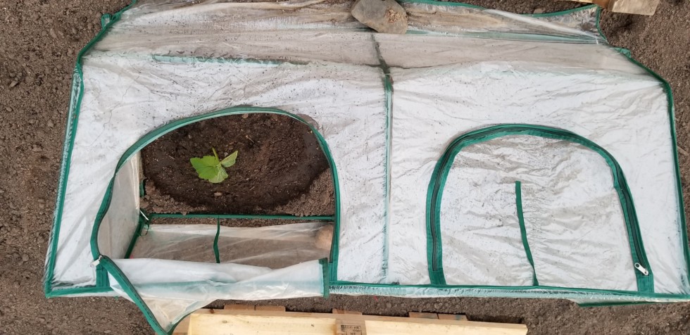 I added most of the amendments to my patch on Saturday. Heating cables and cloche are up, and the Stevens is in the dirt in the premium location. I'll watch it for a few days, with the second seedling spending days out in the cloche before I make a decision on where it'll go.