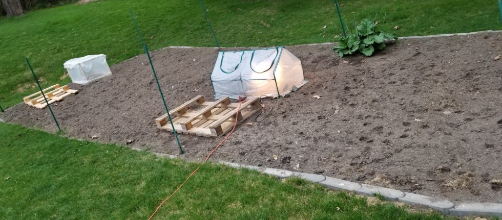 The Stevens seedling is all tucked in for the cool night. The heating cables have maintained a soil temp of 68-70, but I figure the lamp for one or two more night can't hurt. The 6$ pumpkin shanty at the other end of the garden is in, but the Steil seedling won't be going in the dirt until Sunday.