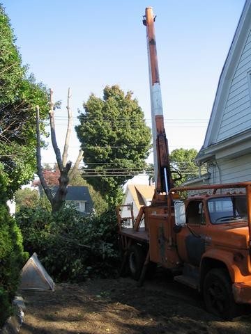 Note the "vintage" equipment my tree guy is using. His extremely low overhead save me a fortune. Plus he doesn't live far from here so I know where to find him if something did go wrong. Yes, he has insurance.
