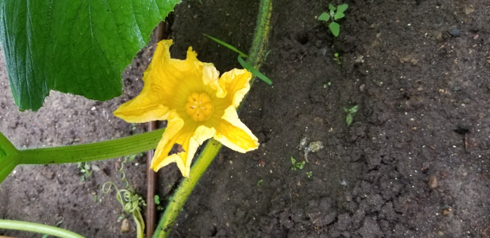1764 Stevens X 1724.5 Steil. 1.3 inches of rain over night... would have been happy with a quarter inch. Favored flower on the main vine opened, as did two Steil males. Main vine tip broke off around 6ft down from the females (wind?)-- have one more shot on the main, will have a total of 3 pollination attempts.