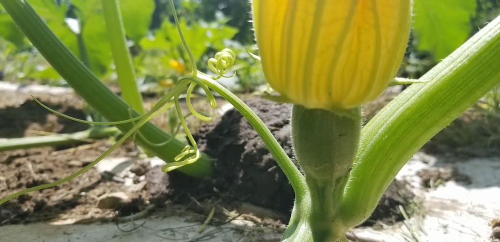 Picture taken June 26th 2018. This was the first female flower. This grows into a decent little pumpkin. You can see that since the vine was growing on top of cardboard it couldn't anchor a root at the joints. I cut holes in the cardboard at specific joints. I made mix of compost, sand, and soil mixed with water til muddy and covered the joints where I cut through.